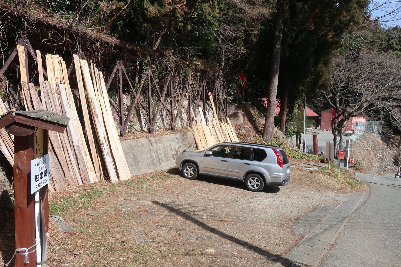 ・くぬぎむら体験交流館の隣にある「くぬぎの七曲り花めぐり」用駐車場を利用。5台程度停められます。