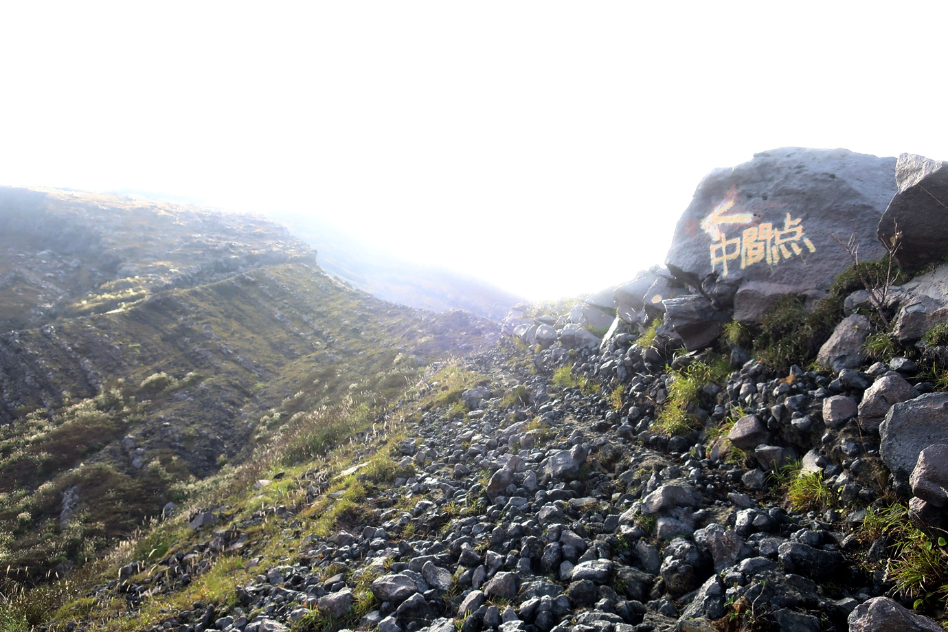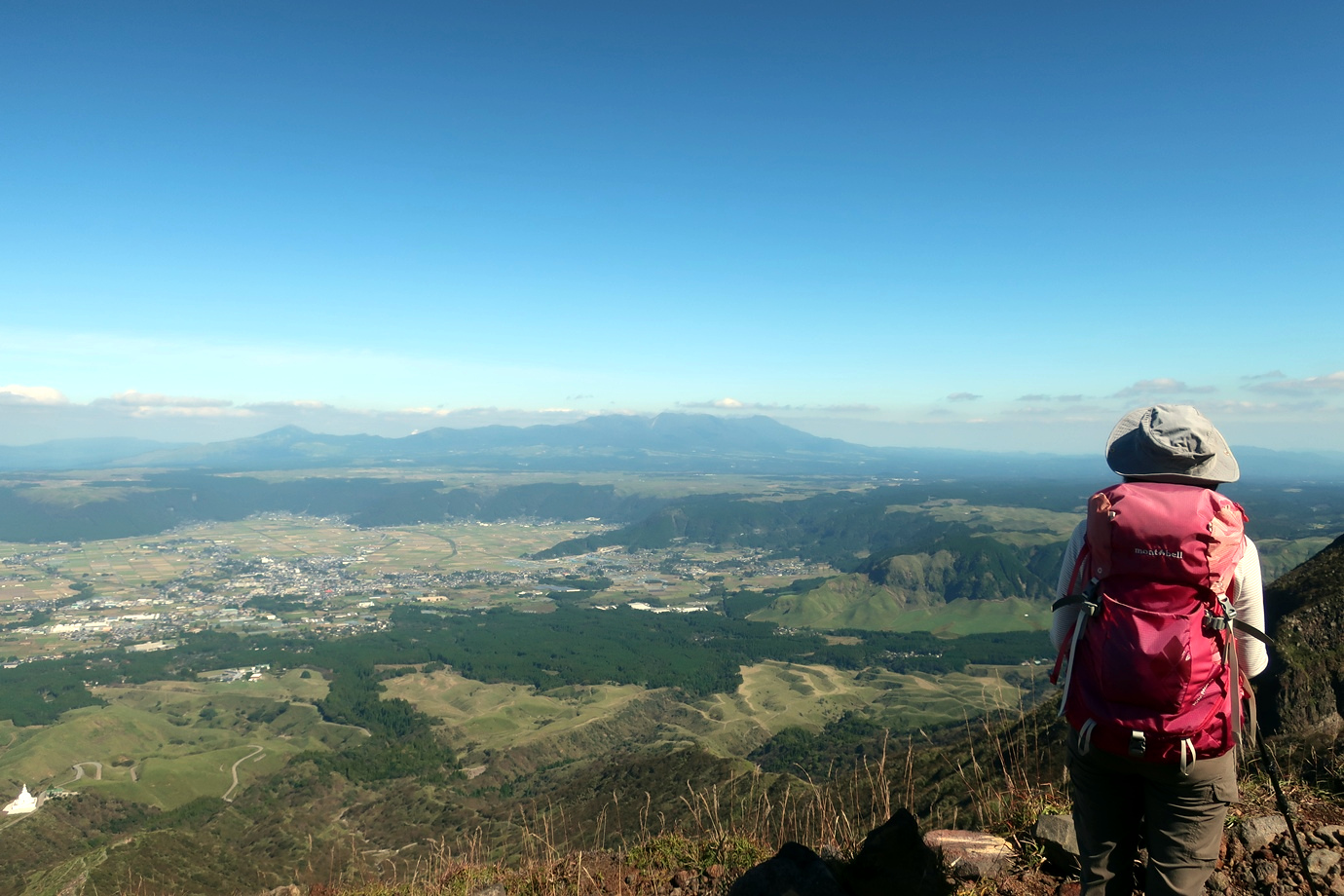 中間点からさらに登って歩いてきた道方面を振り返った画。こっちの景色もいいです。明日登る予定のくじゅう連山が見えてます。