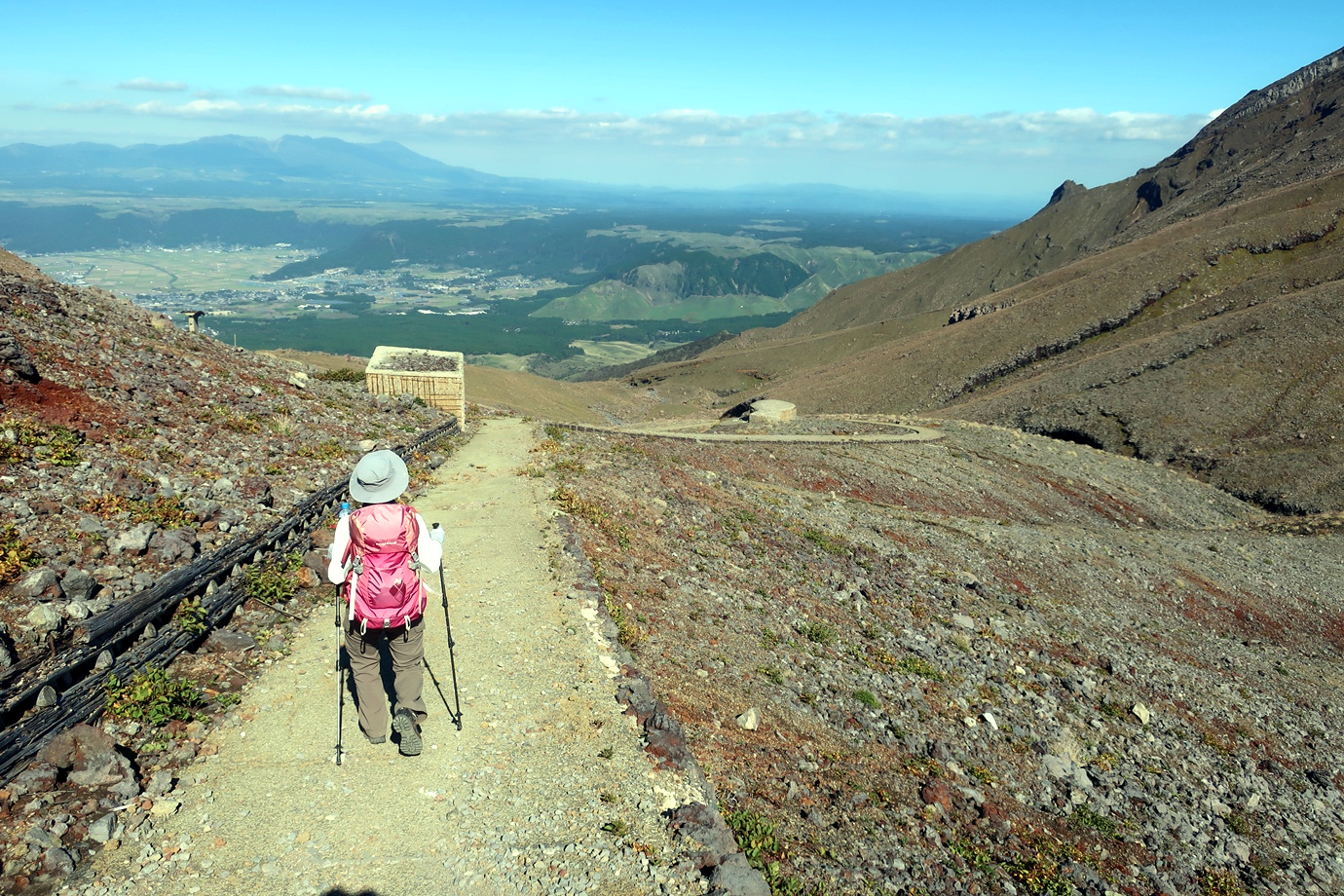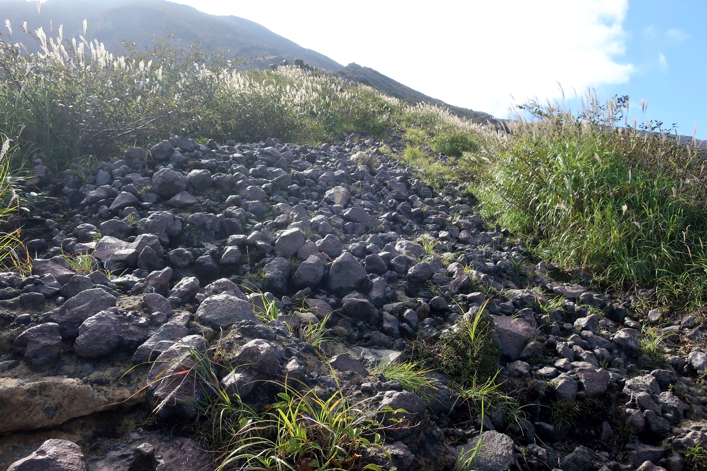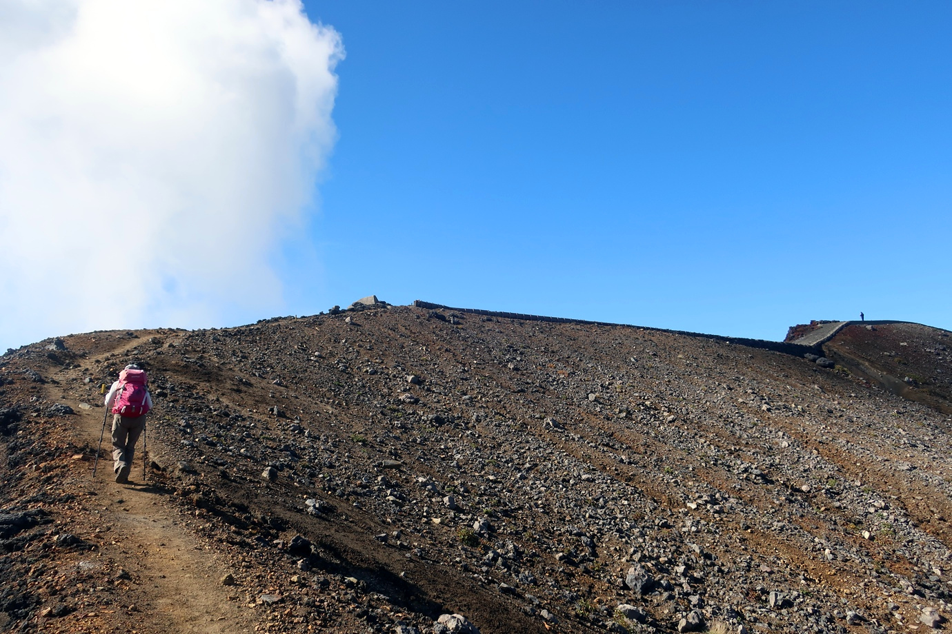 しかし、中間点を過ぎたあたりから大火口からと思われる噴煙が視界に。元気も出てきます。