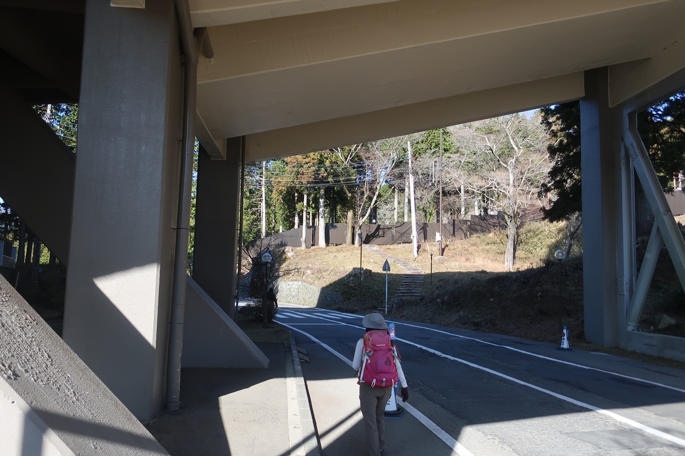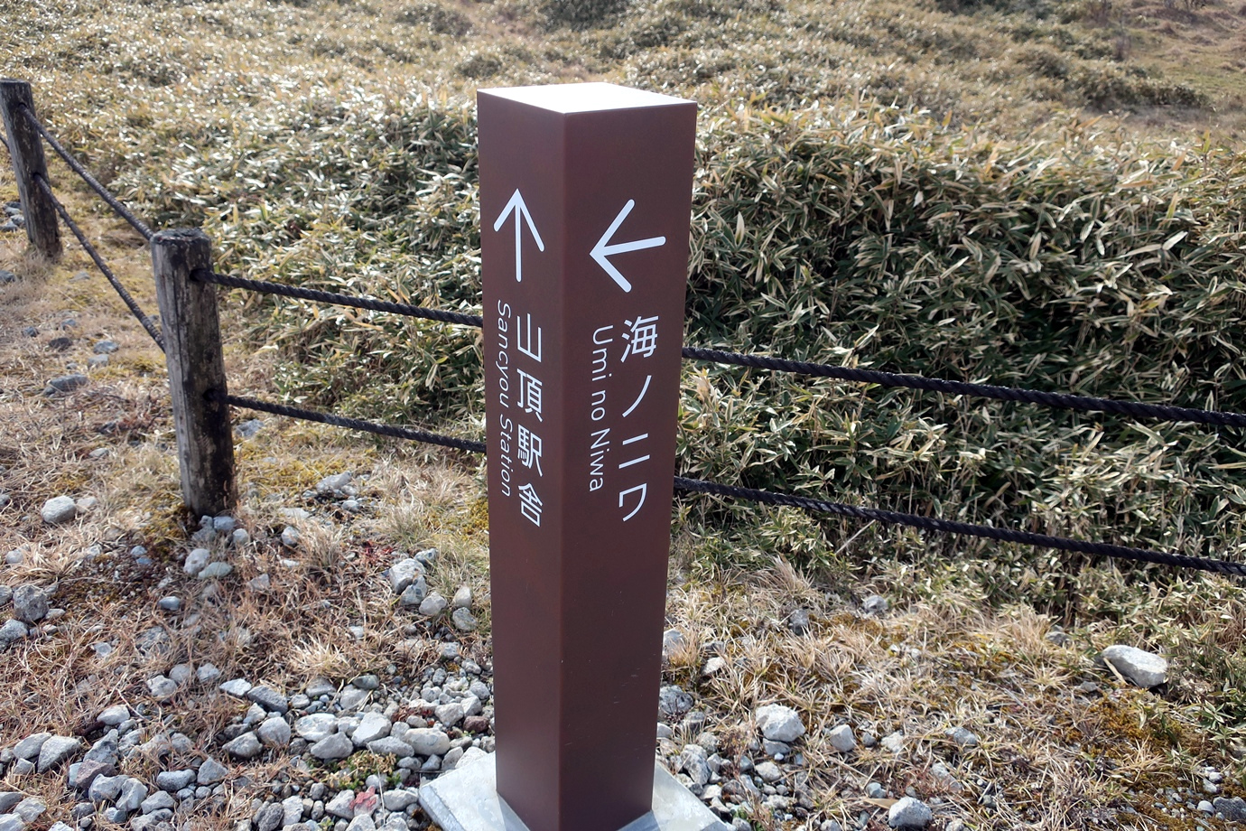 駐車場を出たら左へ歩き、ロープウェー設備の下を潜って……