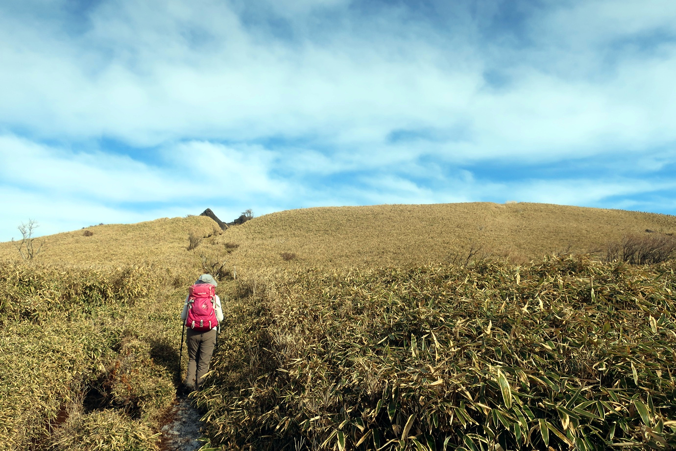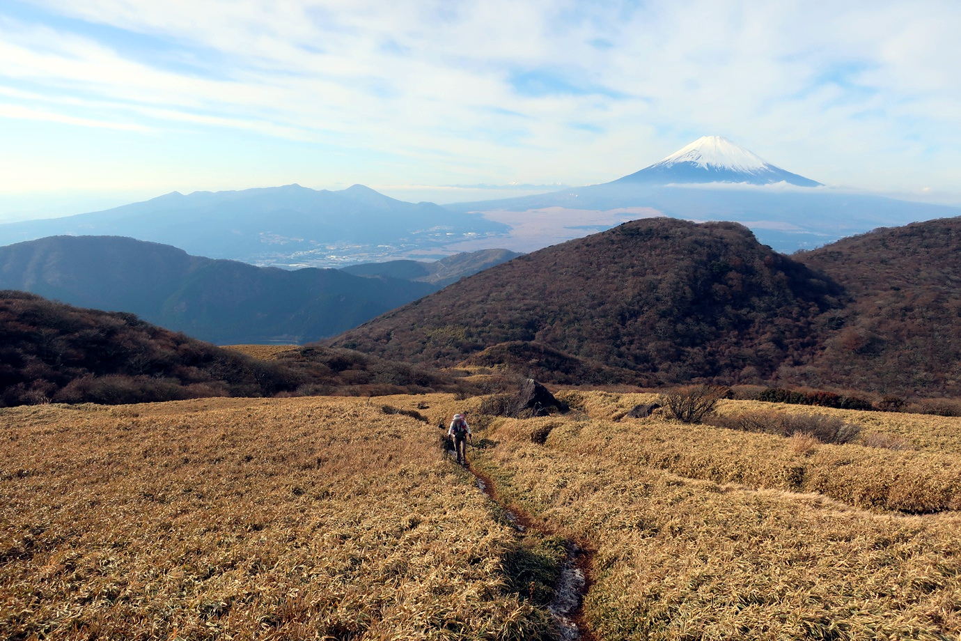 富士を背に気持ちのいい笹原をぐいぐい登っていくと……