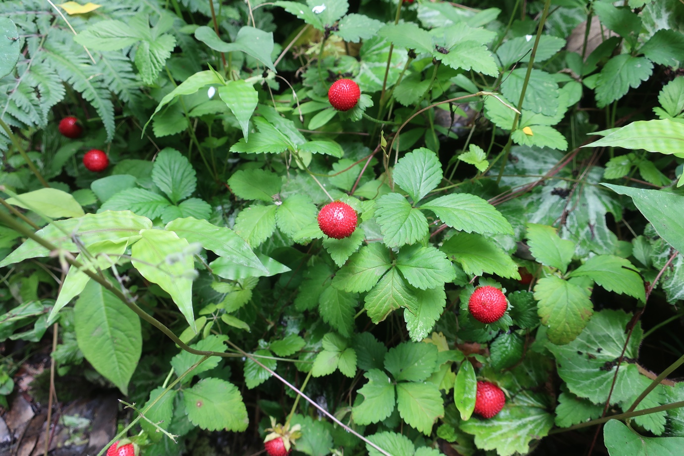 大きなヘビイチゴがたくさん実ってました。無毒ですが、おいしくはないそうです。