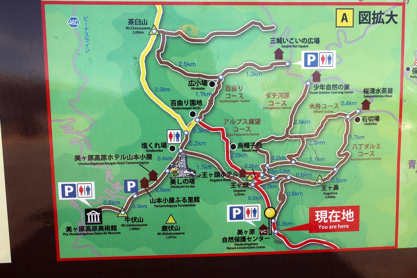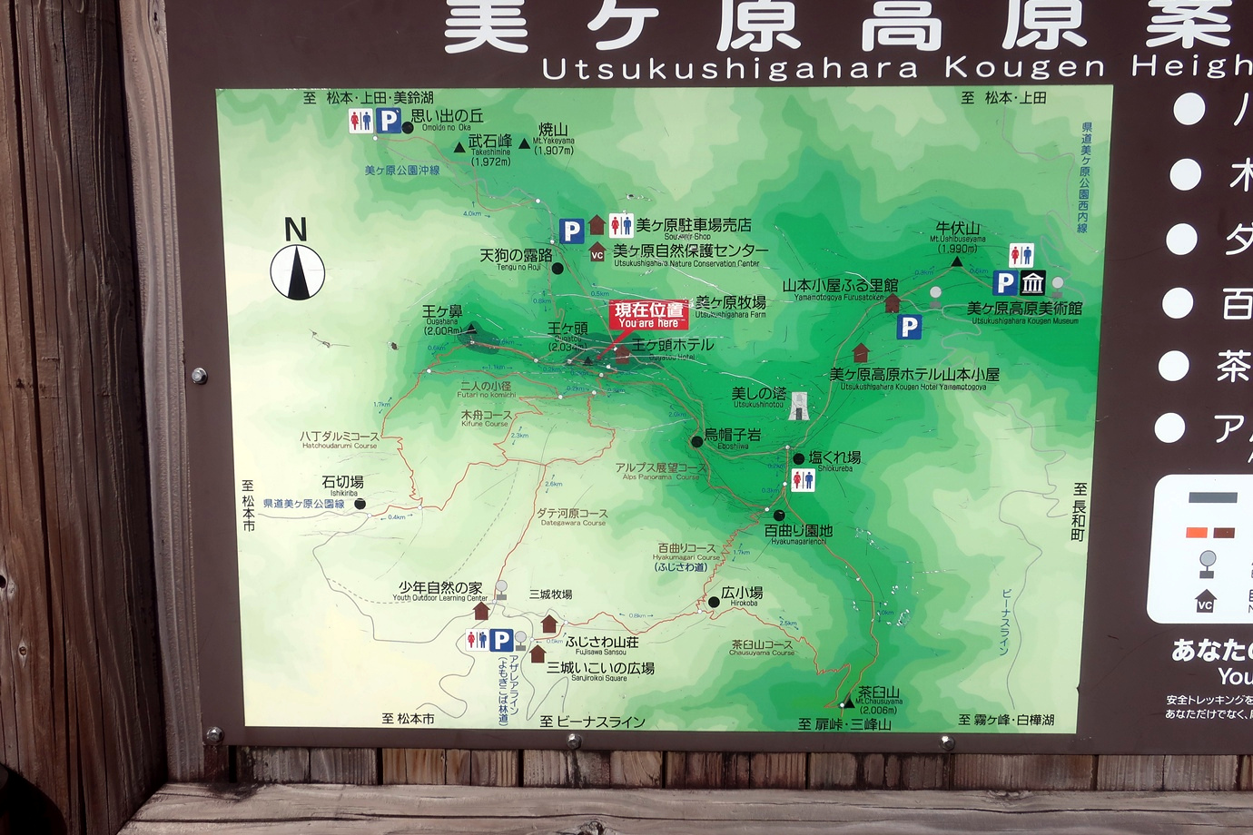 思い出の丘駐車場から車で約5キロ、10分弱移動して美ヶ原自然保護センター駐車場に到着。ここから王ヶ鼻~王ヶ頭へ。