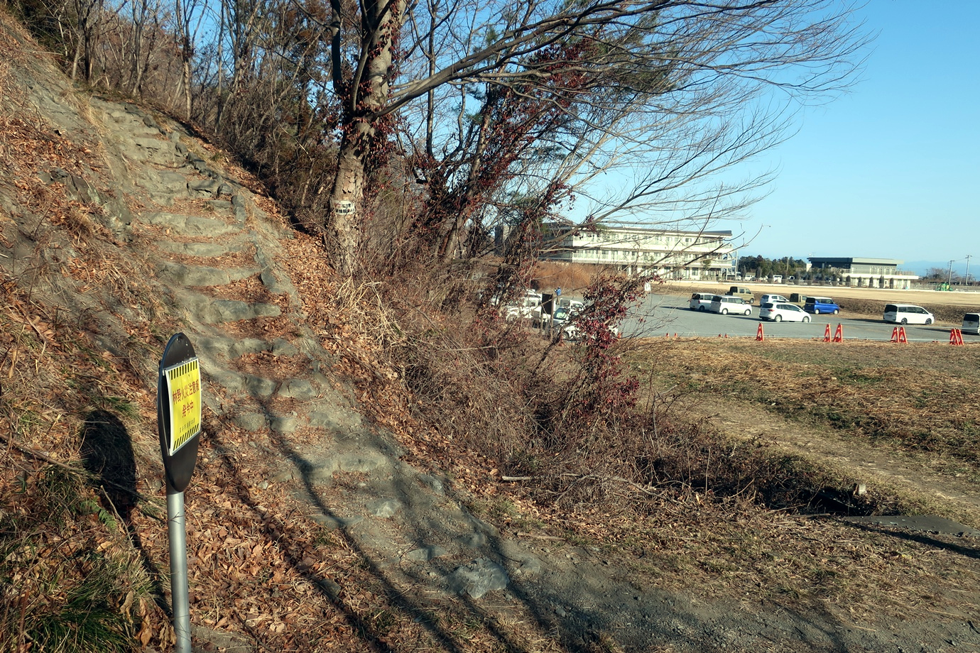 駐車場からこっちに歩いて写真の階段を上がっていきます。